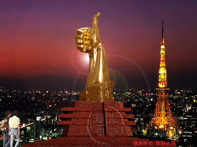 若要用一個詞來形容眼前的雕塑,莫過于“芝華士”了,沿用克里斯汀·拉科魯瓦對芝華士的評價“在我看來,有些名字,哪怕只是聽人提起或在書中偶遇,就會不自覺地將其與'聲名顯赫'聯(lián)系起來,因為這些名字本身就代表著一種品質(zhì)、一種權(quán)威或者一種奢華氣質(zhì)。對我而言,'芝華士'這三個字就是'時尚'、'奢華'、'尊貴'的代名詞。”一種酒何以用“奢侈”、“最貴”、“時尚”來形容?路人皆知,喝芝華士是一種享受,將酒提升為藝術(shù),由內(nèi)而外的品鑒,是一種邊緣文化潮流化,這一切不僅源于調(diào)酒師Colin Scott以及精湛絕倫的技術(shù),而且他擁有世界頂級設(shè)計師克里斯汀·拉科魯瓦、亞歷山大•麥克奎恩。然而一尊雕塑,何以用一種酒來代稱?其實不然,芝華士的定義早已并非一樽酒而已,芝華士,享有世界蘇格蘭高級威士忌,他是外在與內(nèi)在的統(tǒng)一,誠如雕塑所塑造的舉起的大拇指,同等的是一種邊緣文化,她需要人們鑒賞品位,需要足夠的情趣與審美素質(zhì)。如同芝華士所代表的“時尚”“豪華”“尊貴”,雕塑依然具有最豪華的陣容,華麗端莊的金箔,剛毅的輪廓,以及人類機理特征所表現(xiàn)的自然之美,他是藝術(shù)家獨具匠心的杰作,是一樽東方的皇室威士忌,享有與芝華士同樣的尊榮。用它來界定雕塑,而且是眼前獨具匠心的雕塑,是源于其洗凈鉛華般的唯美設(shè)計風(fēng)格以及其醇和出眾的口感,如雕塑從內(nèi)而外,周身所散發(fā)出的氣質(zhì)。